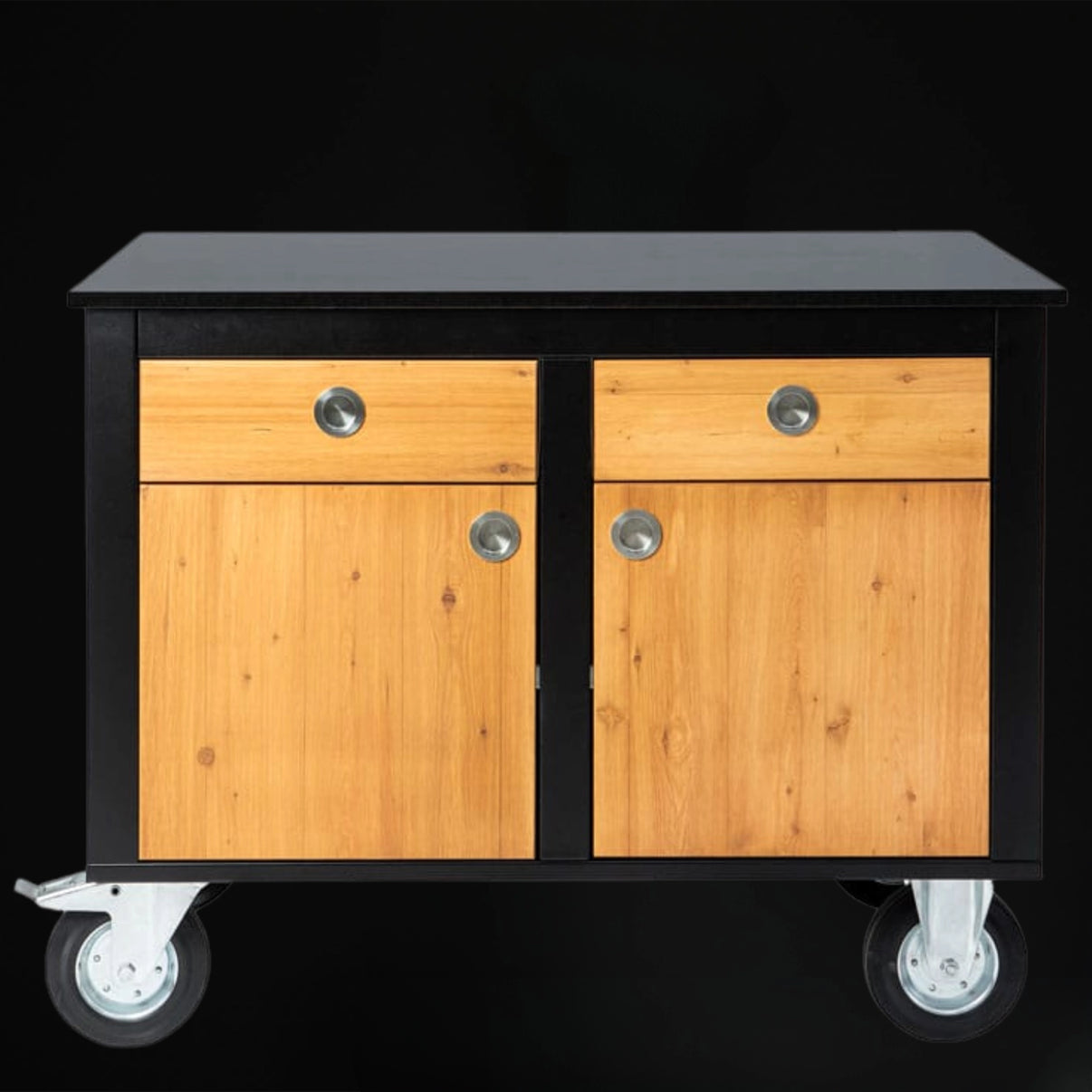 Arbeitsfläche aus Granit, alle Holzteile aus Lärche, Rahmen aus pulverbeschichtetem Stahl, Vollgummiräder, Feststellbremse.